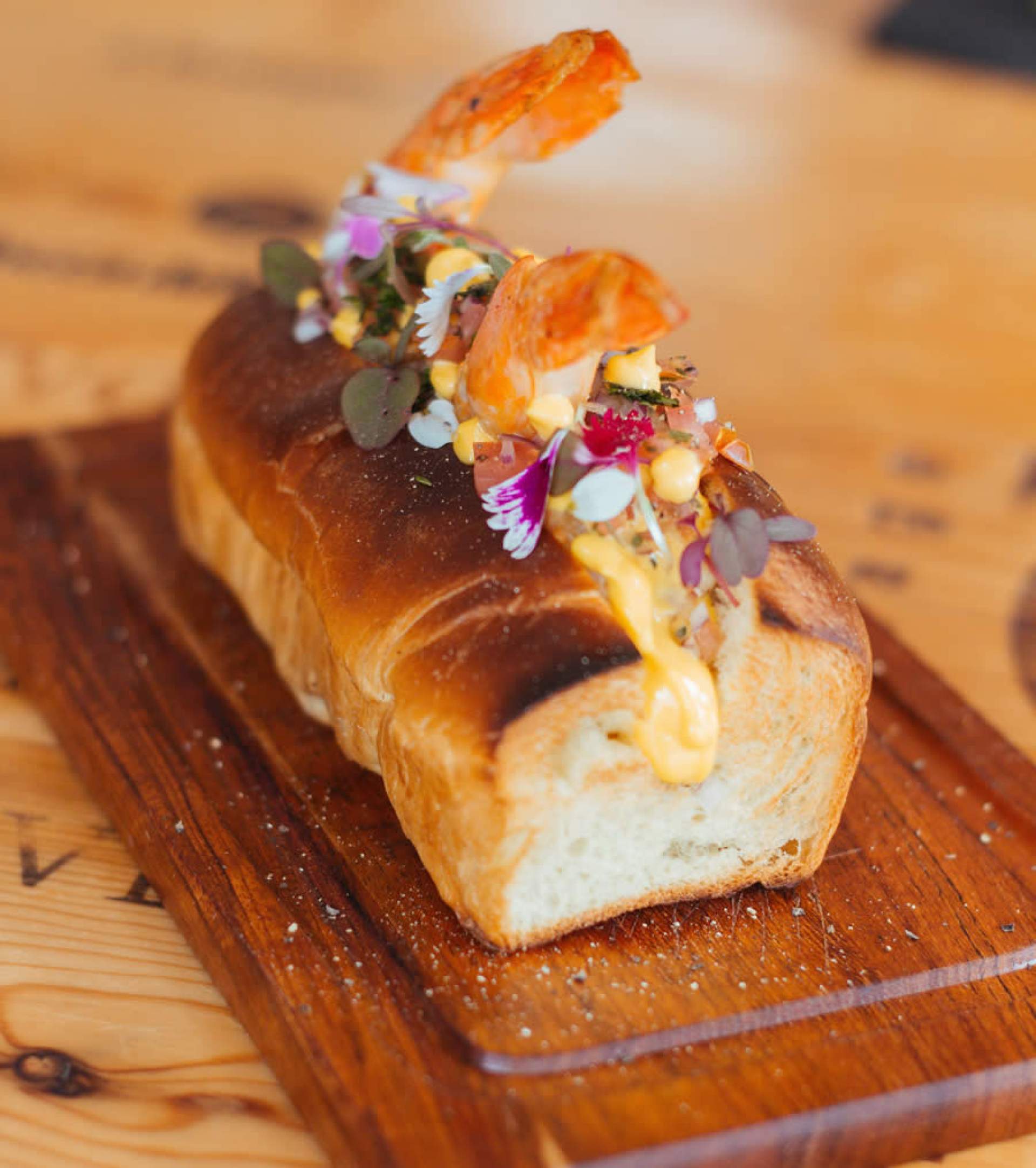 Tempere os camarões com sal e pimenta e alho picado. Aqueça uma frigideira e salteie os camarões na manteiga e reserve. Em um liquidificador coloque o leite, limão, pimenta malagueta, sal e pimenta do reino. Bata tudo e com um pouco de óleo de canola vá regando a porção ate emulsionar o creme e depois leve para a geladeira. Pincele o pão com manteiga e leve ao forno para dourar. Corte a cebola roxa e o tomate cortado em brunoise – pedaços pequenos e irregulares –, acrescente o coentro picado e tempere com sal e pimenta do reino. Na montagem retire o pão do forno, fatie o centro com cuidado, acrescente os camarões, a maionese de malagueta e por último vinagrete de tomate, cebola roxa e coentro.