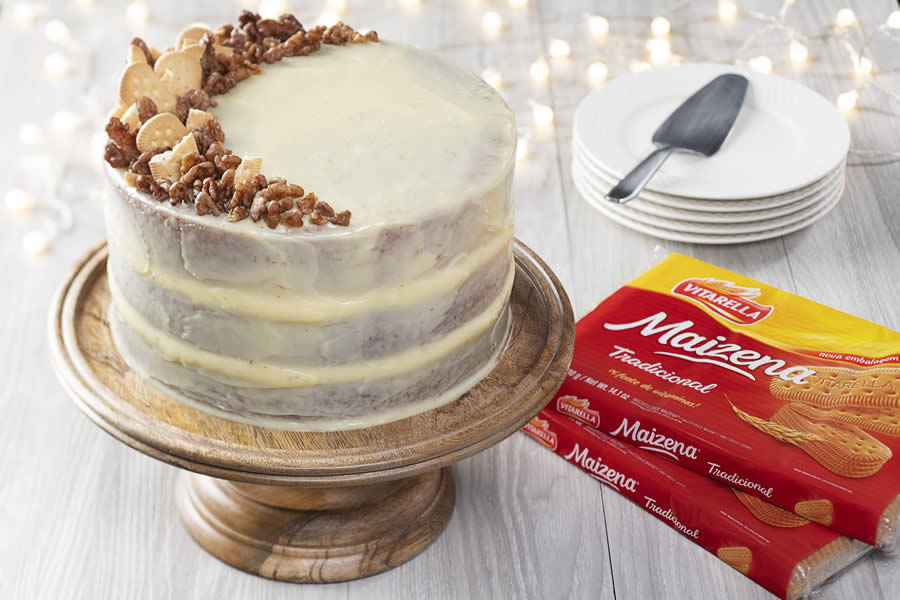 - Disponha o bolo na bailarina e recheie com o brigadeiro branco e pedacinhos de nozes e de biscoito maizena Vitarella. Coloque o segundo bolo e recheie com pedacinhos de nozes e de biscoito maizena Vitarella. Finalize com a última camada de bolo e cubra com o restante do brigadeiro. Decore o topo do bolo com pedacinhos de nozes e de biscoito maizena Vitarella.