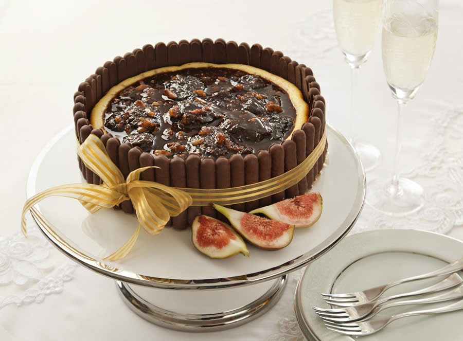 Decore o cheesecake: com um pincel espalhe o mel em toda a volta do cheesecake, bem rente à base, e “grude” os palitos, lado a lado. Finalize com uma fita e laço. Misture as nozes na calda e distribua sobre a superfície do cheesecake. Deixe em geladeira até o momento de servir.
