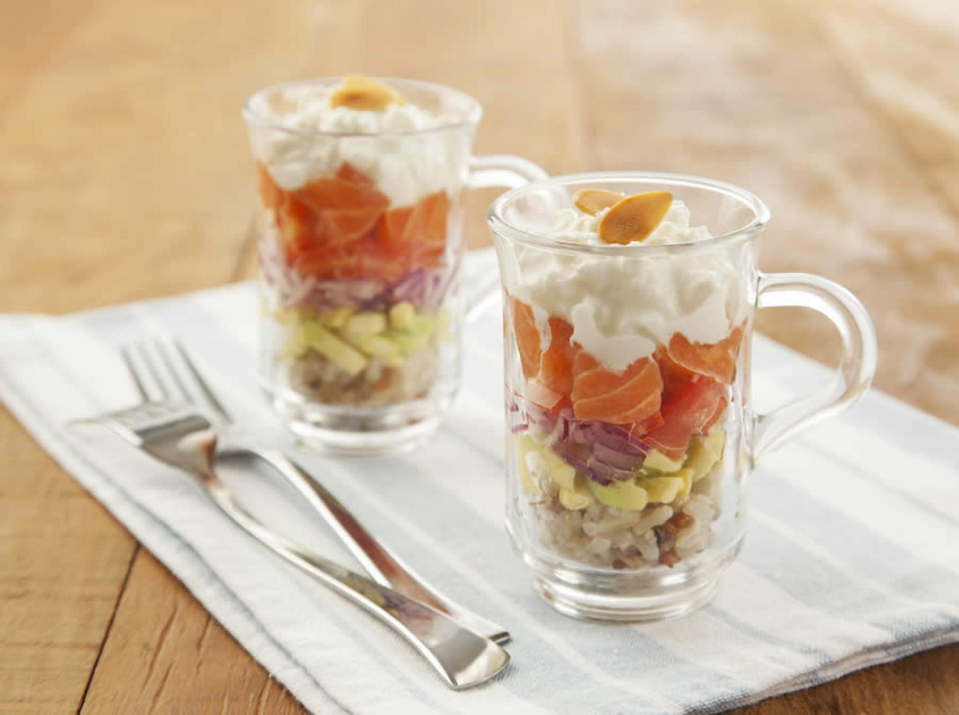 - Monte o “poke” em bowls individuais: faça uma camada com o arroz, seguida por camadas de abacate, de cebola e de tomate; cubra as camadas com o peixe marinado e, por cima, coloque 1 colher generosa de Queijo Cottage Tirolez. Finalize salpicando as amêndoas e sirva em seguida.