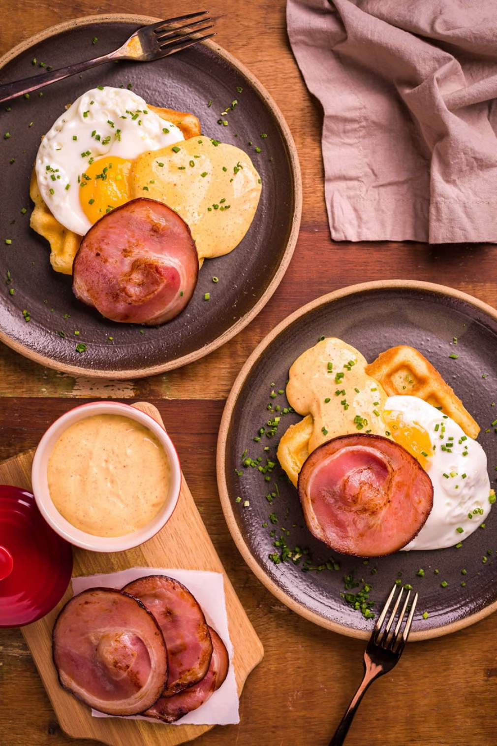 Sirva o waffle no prato, coloque sobre ele o ovo frito e o bacon, e bom apetite.