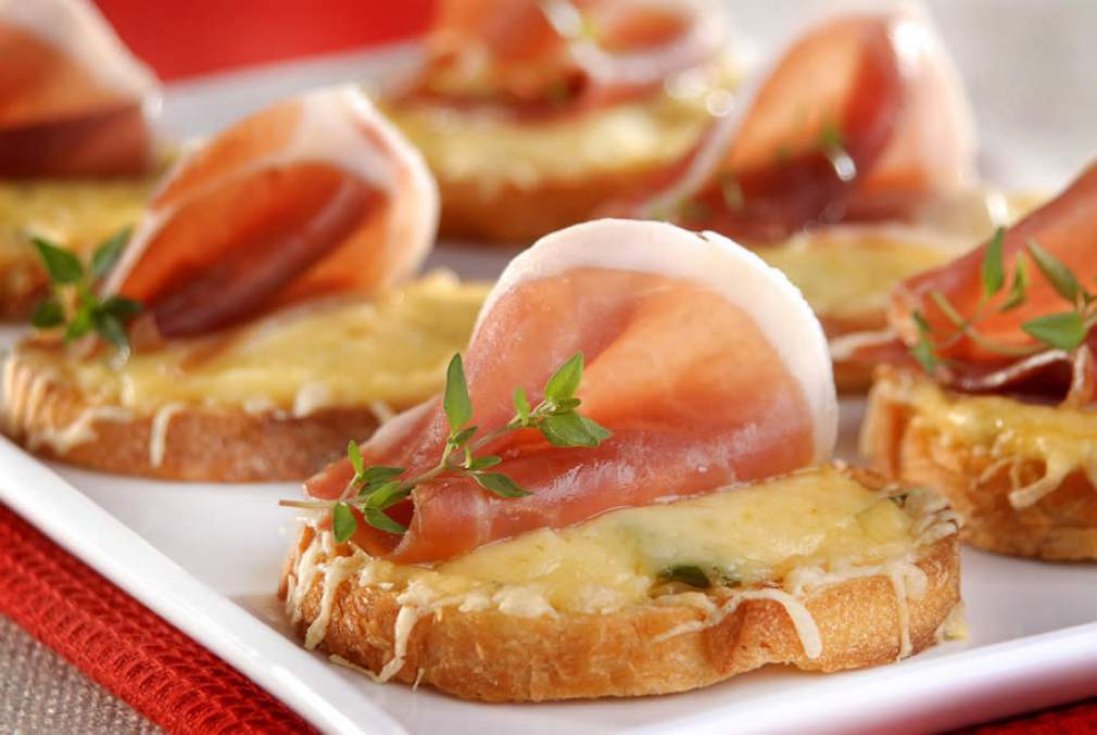- Assim que retirar a bruschetta do forno, coloque as fatias de presunto por cima, montando para dar volume, e sirva em seguida, ainda quente.