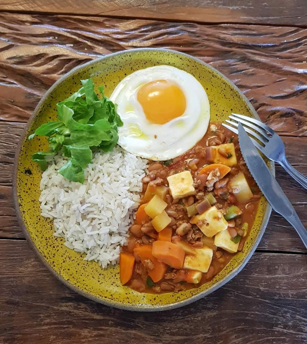 Feijão com carne moída e legumes