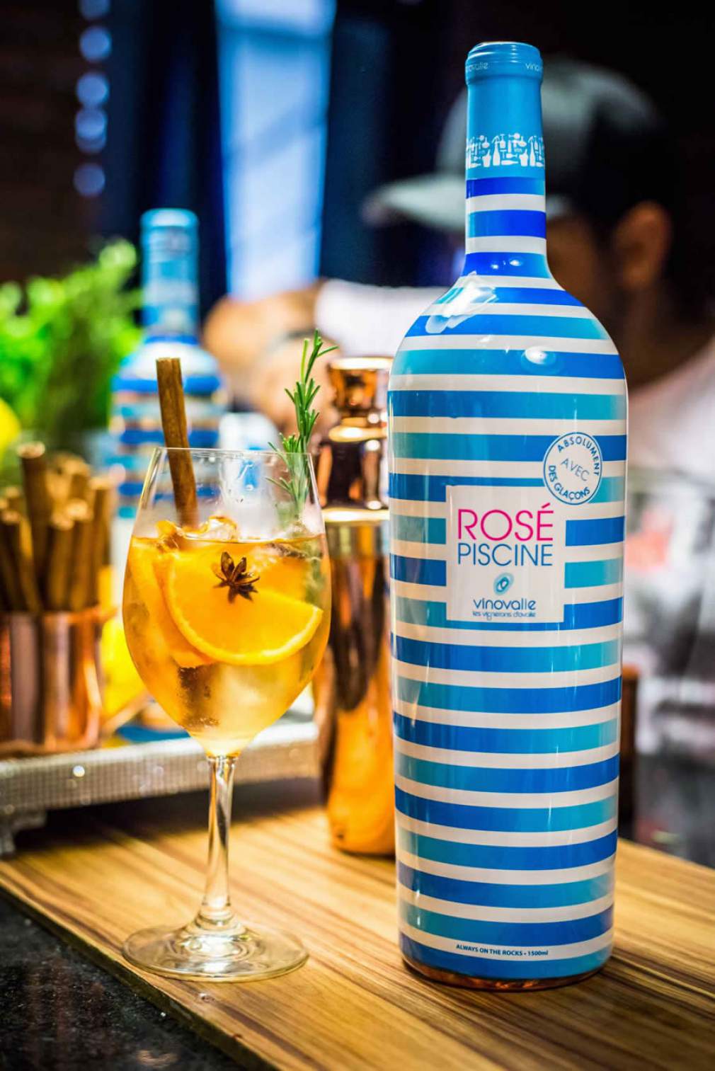 O Rosé Piscine é uma bebida sofisticada e irreverente, já que possibilita ao consumidor degustar o vinho de forma diferenciada – com duas a três pedras de gelo. Feito sob medida para aqueles que gostam de drinques refrescantes, ele é composto por 100% de uva Negrette, traz graduação alcoólica de 11% e deve ser consumido em uma temperatura que varia entre 6 e 8 graus. Seu aroma é levemente frutado, com notas de pêssego, limão e morango e traz um sabor com toque de lichia, mistura que proporciona um final exótico para quem o aprecia. Reconhecido como o primeiro vinho rosé do mundo a ser bebido com cubos de gelo, Rosé Piscine tem se tornado cada vez mais uma das preferências dos brasileiros, sendo o vinho francês importado mais vendido no Brasil, em 2018 –, segundo dados da Ideal Consulting. Seu rótulo colorido, com listras azuis e brancas, a garrafa se destaca em qualquer lugar que é exibida. Este refrescante vinho foi criado em Saint-Tropez e produzido na região sudoeste da França, país onde a bebida vende mais de um milhão de garrafas por ano.