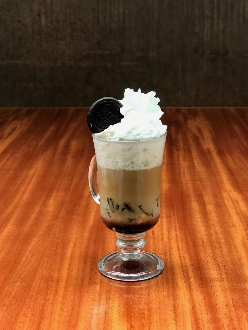 Em uma taça bill (taça para café ou similar) coloque 2 bolachas quebradas, adicione a calda, coloque o leite vaporizado e o espresso no centro, para que fique trifásico. Coloque um caracol de chantilly e decore com uma bolacha.