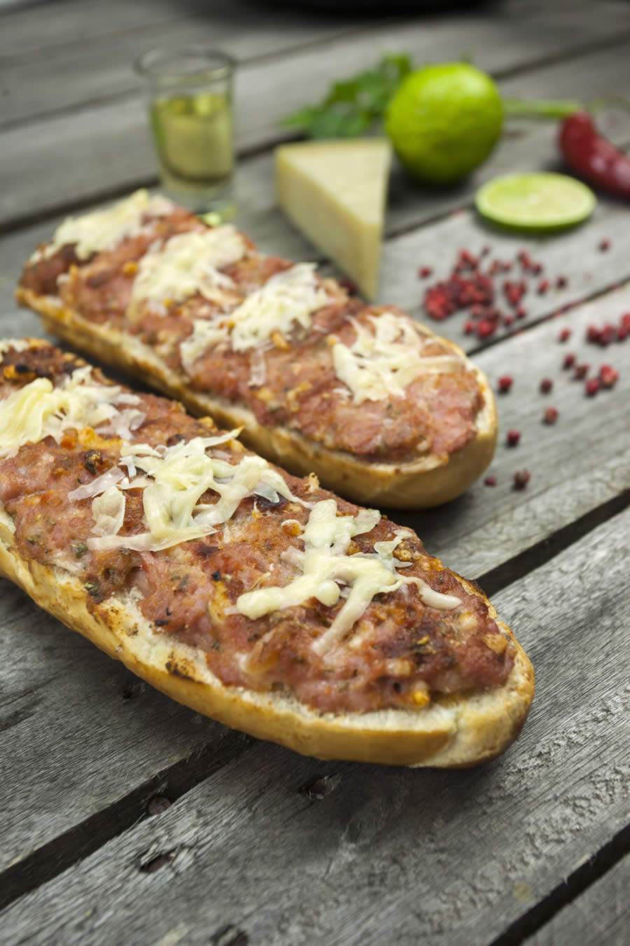 Retire a tripa da linguiça e separe a massa em um recipiente. Coloque o queijo parmesão ralado, o orégano, o suco de limão, a cachaça e misture tudo. Corte a baguete ao meio e coloque essa a mistura em cima da baguete cobrindo toda a extensão. Leve para a grelha no braseiro médio (40 cm da brasa) com a massa para baixo por 20 minutos. Vire e deixe dar uma dourada no pão, e depois, só servir.