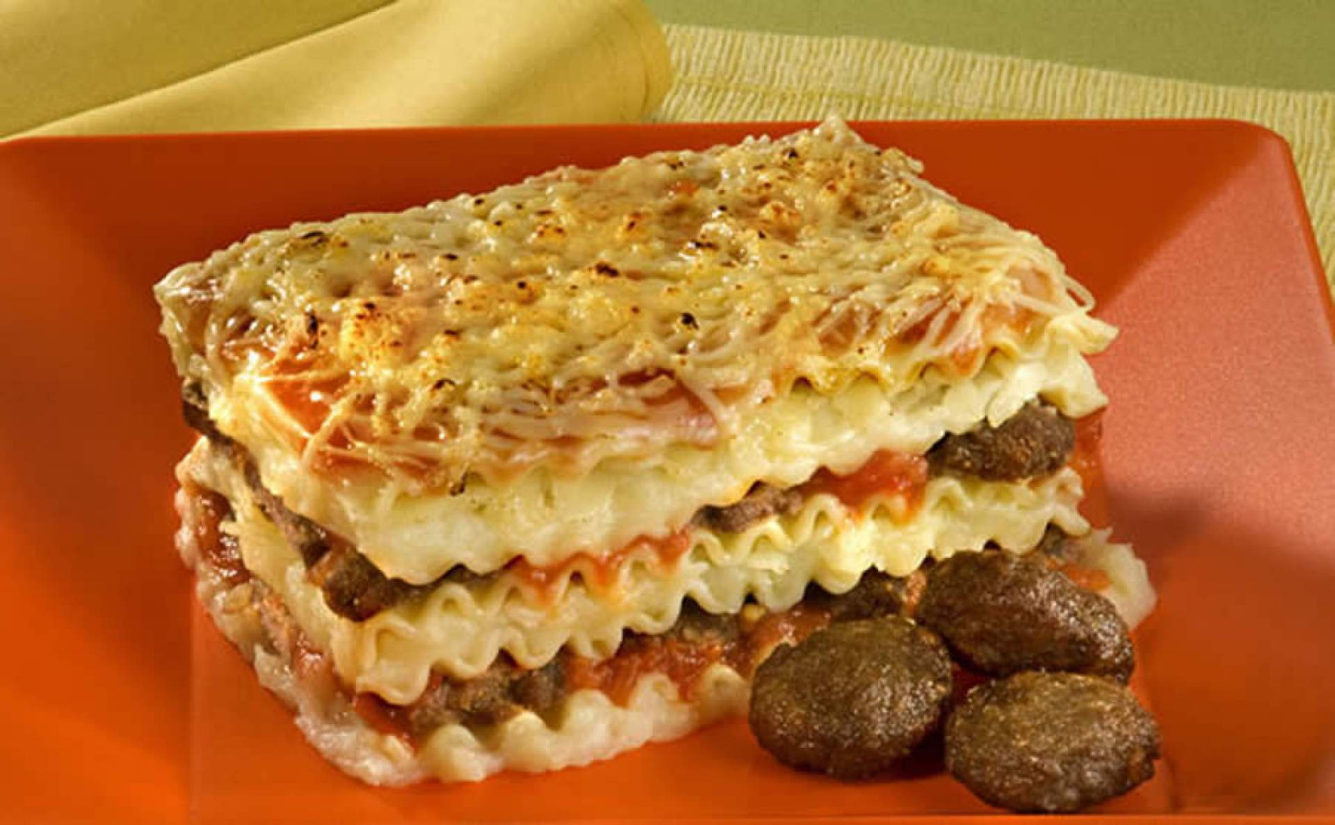 - Monte a Lasanha em um refratário grande e fundo. Divida o molho de tomate e o molho de batata em 3 partes, as tiras de lasanha em quatro e os hamburguinhos e as fatias de mussarela em duas. Alterne as camadas de molhos, massa, hamburguinhos e fatias de mussarela da seguinte forma: molho de batata, fatias de mussarela, tiras de lasanha, molho de tomate, hamburguinhos, tiras de lasanha, molho de batata, fatias de mussarela, tiras de lasanha, molho de tomate, hamburguinhos, tiras de lasanha, molho de batata, molho de tomate e finalmente queijo parmesão. Cubra com papel-alumínio e leve ao forno médio (200ºC) por 50 minutos. Para dourar a superfície, retire o papel-alumínio 10 minutos antes de finalizar o tempo.