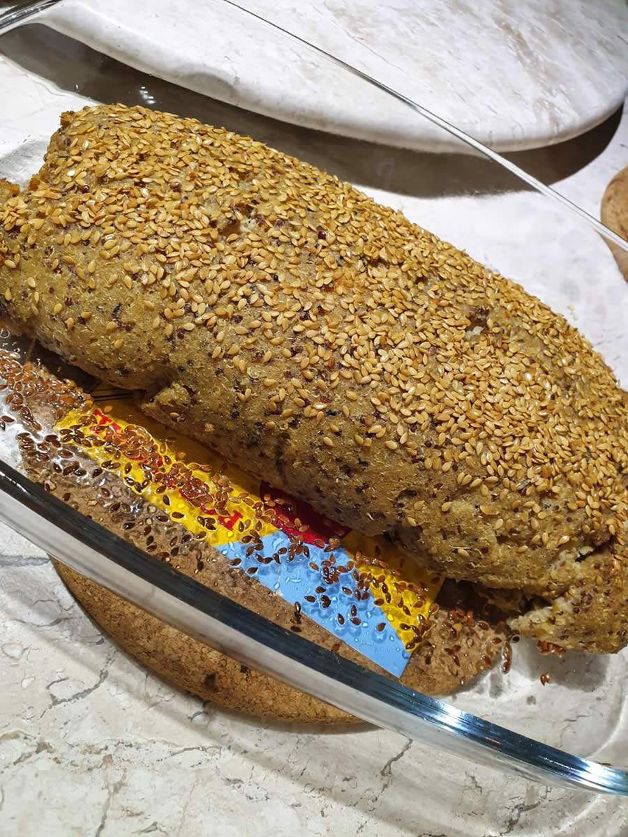Com o auxílio de um pincel passe um pouquinho de azeite sobre o rocambole salpique o gergelim.