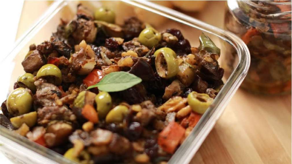 Caponata de beringela com chimichurri de alho negro