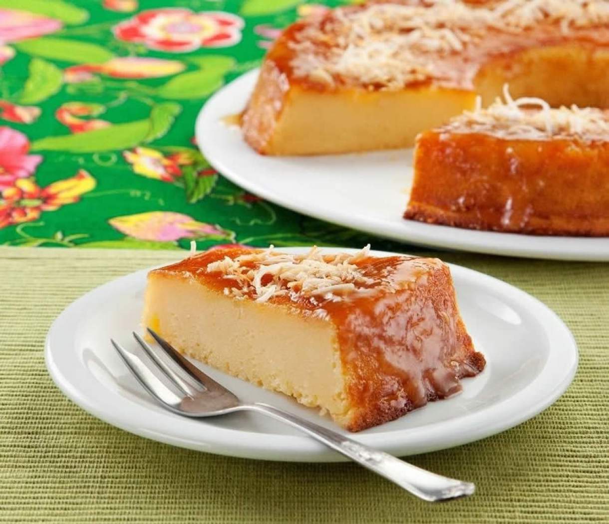 Coloque a massa do bolo na assadeira caramelizada e leve para assar em banho-maria, no forno preaquecido, à temperatura de 170ºC, por cerca de 1 hora e 30 minutos ou até que ao enfiar um palito no centro do bolo, este saia seco.