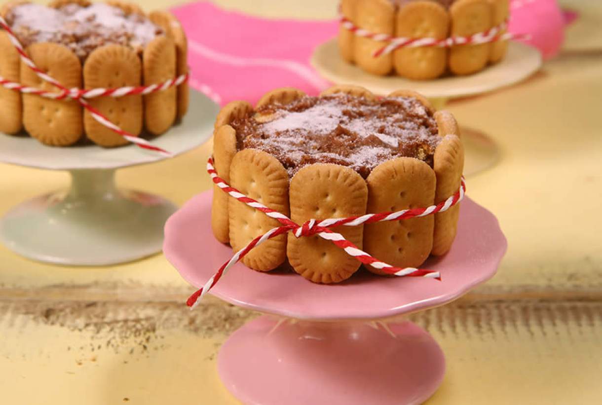 2- Arrume os biscoitos mini maizena Marilan reservados, em volta do doce e decore com uma fita.