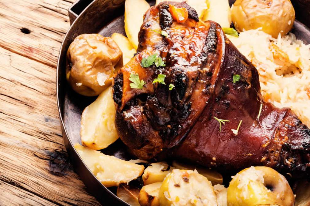 Retire do forno, coloque em uma travessa. Coloque as maçãs de um dos lados do pernil e o purê do outro. Por fim, regue a carne com o caramelo das maçãs.