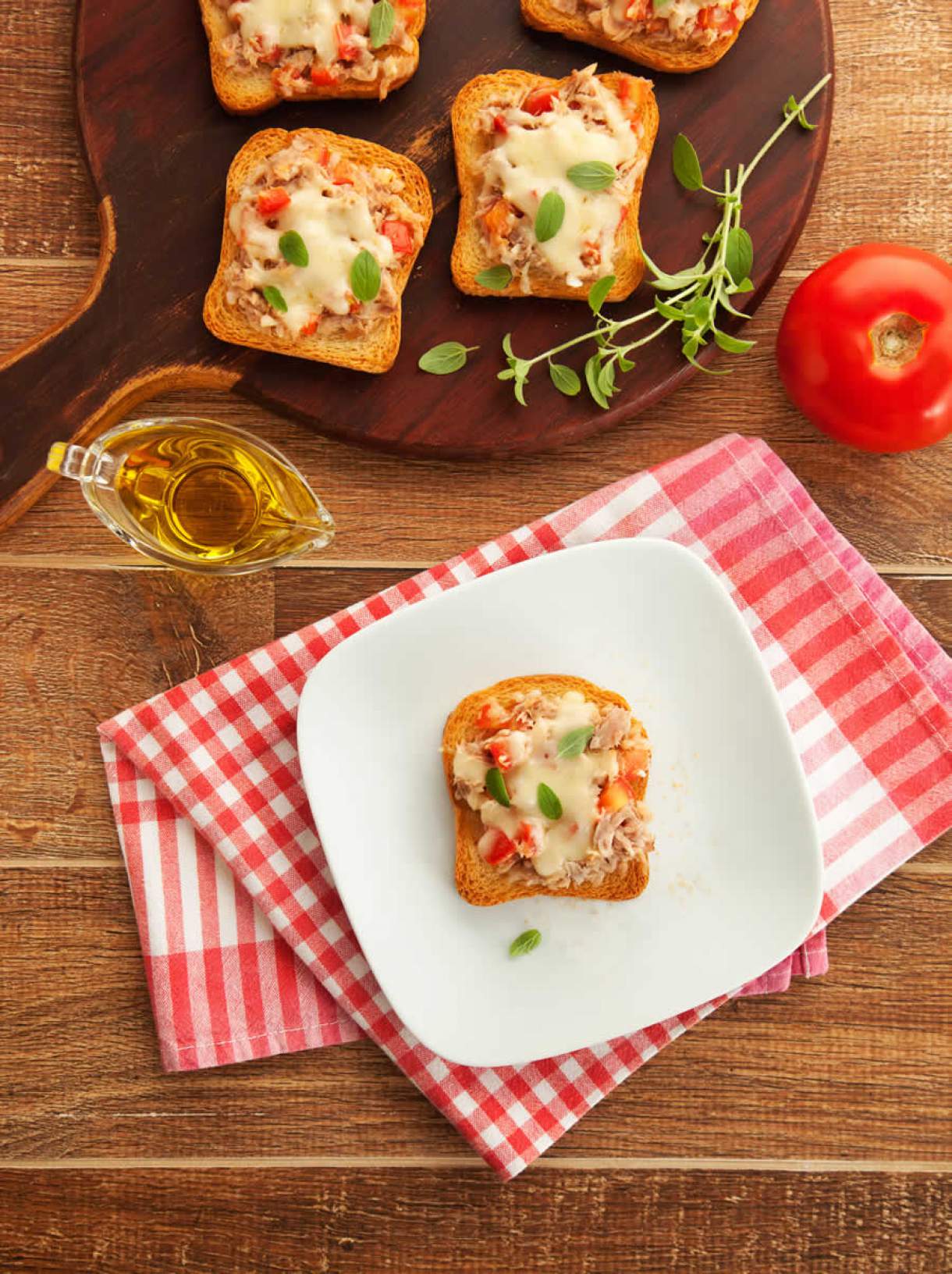 - Sobre cada torrada, porcione um pouco do atum temperado, salpique a mussarela e leve ao forno médio, preaquecido, por 2 minutos para derreter o queijo. Retire do forno e sirva imediatamente.