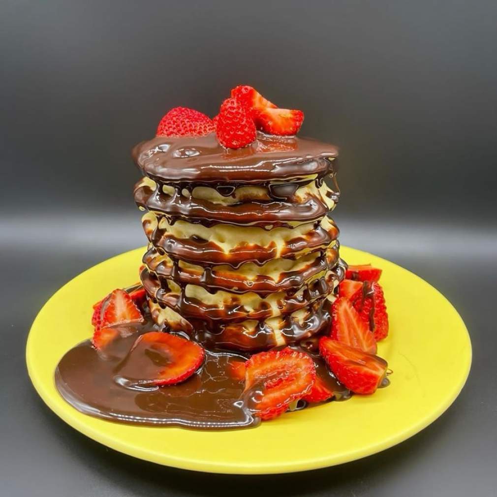 Em uma frigideira antiaderente passe um papel com um pouco de óleo ou manteiga, despeje com a ajuda de uma concha a porção de massa desejada, espere a panqueca perder o brilho e vire para uma leve caramelizada. Sirva com a calda de chocolate e decore com morangos frescos