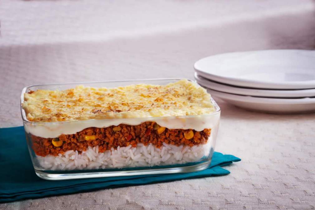 Em um refratário retangular pequeno (26 x 16 cm), adicione o arroz branco Camil cozido, o refogado de atum ralado em molho de tomate COQUEIRO reservado, a muçarela e o requeijão