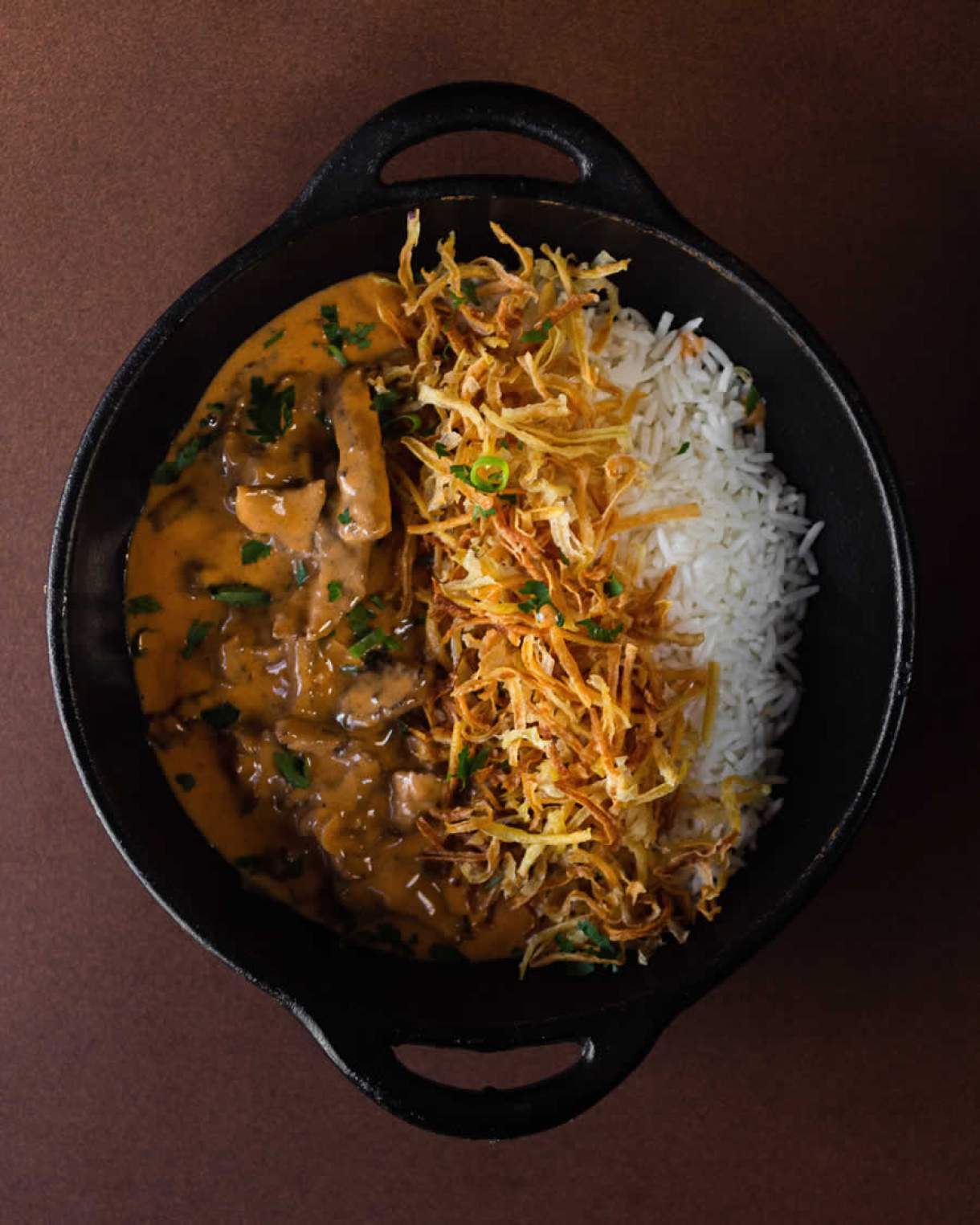 Strogonoff de Mignon Suíno com Palha de Mandioquinha
