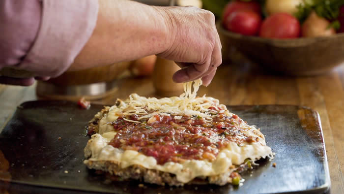 7 – Em um refratário ou uma tábua, faça uma cama de molho do rústico, coloque o bife à parmegiana, adicione o restante do molho rústico, e faz um acabamento com queijo parmesão e cheiro verde. Dica: para uma última derretida no queijo, coloque algumas brasas num refratário de alumínio e segure por poucos minutos em cima do bife. Pronto para servir.