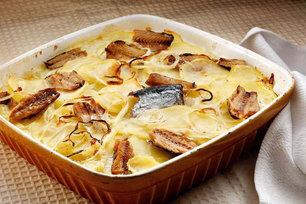Num refratário ou assadeira redonda média, intercale camadas de batata, cebola e Sardinhas Gomes da Costa. Finalize com uma camada de batata. Reserve.
