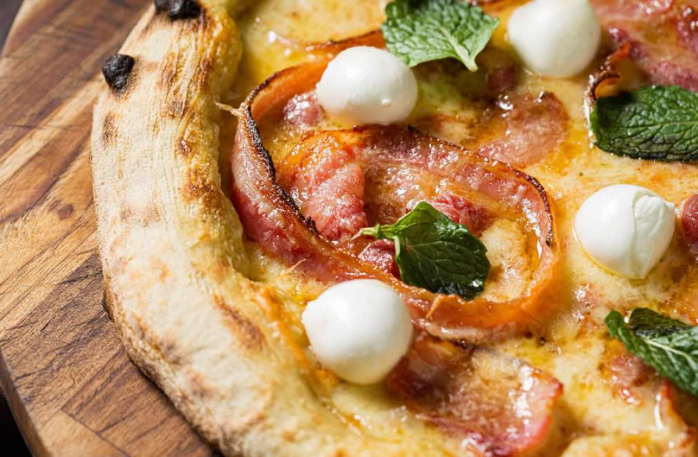 PIZZA DE PANCETA, BÚFALA E HORTELÃ