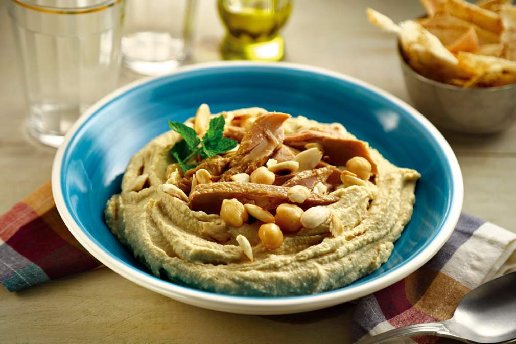 Coloque a pasta de grão de bico numa travessa. Distribua sobre a pasta os Filés de Atum Gomes da Costa. Regue com metade do azeite do Filé de Atum, salpique com a hortelã, as amêndoas e os grãos de bico reservados.