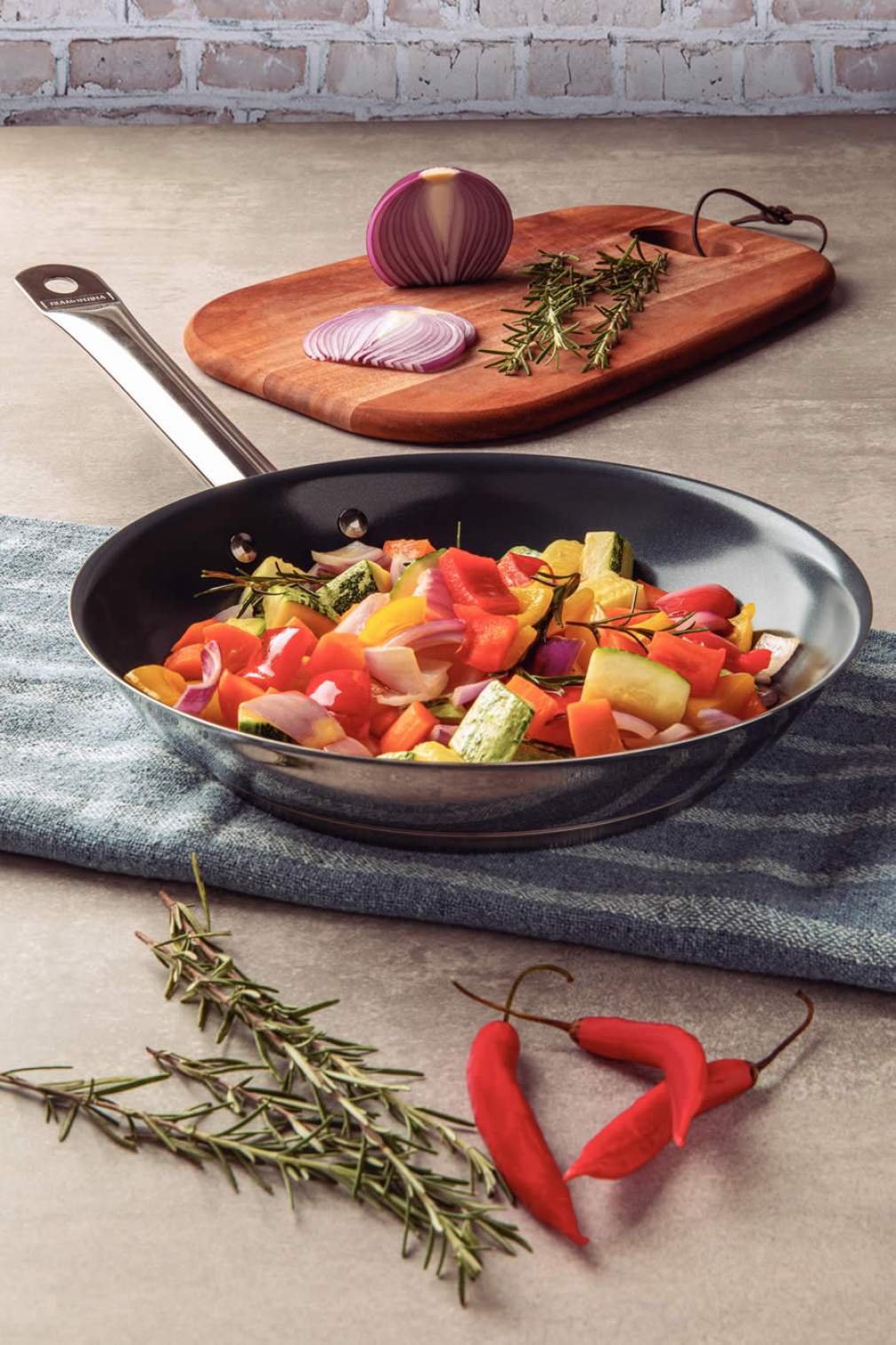 - Quando refogar todos legumes, voltar com todos eles na frigideira, acrescentar todo o azeite de oliva e refogar por mais alguns minutos (fogo médio).