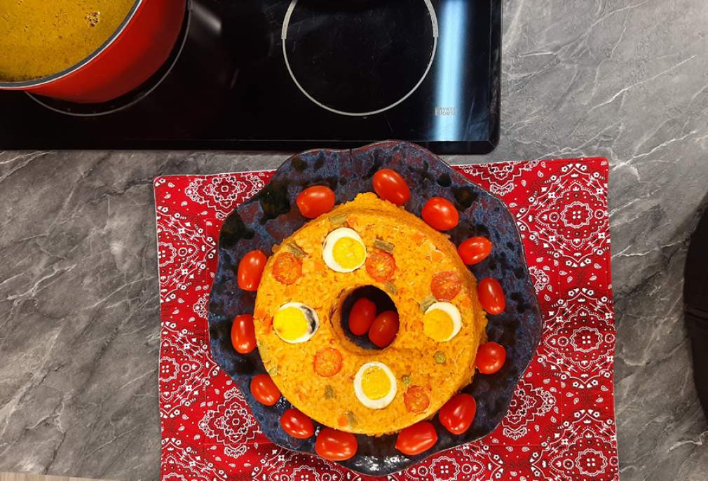 Unte uma forma de pudim com óleo e farinha de trigo. Preencha os espaços com uma parte do risoto já frio, no centro livre coloque o recheio e a muçarela, finalize com restante do risoto por cima. Leve para assar em forno pré-aquecido a 200º até dourar.