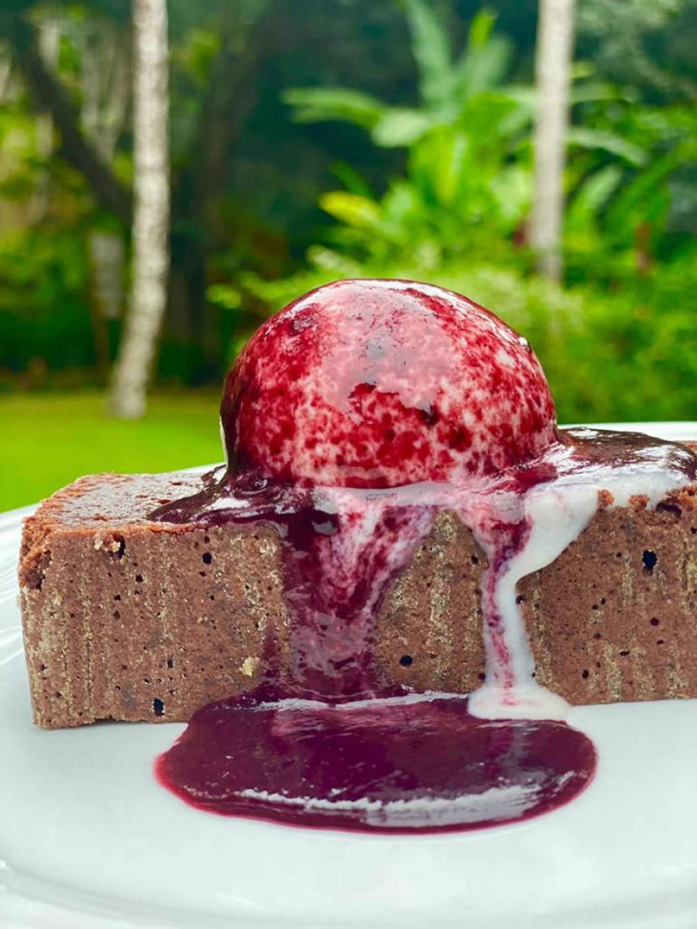'Terrine de chocolate com calda de frutas vermelhas e sorvete de cacau' é uma deliciosa sugestão de sobremesa do Itacaré Eco Resort