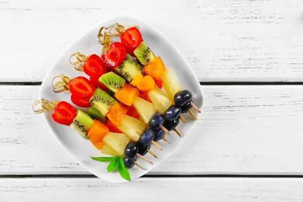 Faça cubinhos com as frutas e monte os cubos em espetinho de churrasco. Leve ao freezer, por 15 a 20 minutos, para que as frutas fiquem com consistência firme. Depois, retire do freezer, finalize com o mel e sirva em seguida.