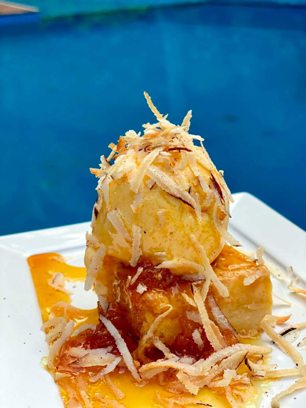 'Cocada de forno com calda de abacaxi, sorvete de baunilha e coco queimado' é uma deliciosa sugestão de sobremesa regional do Itacaré Eco Resort