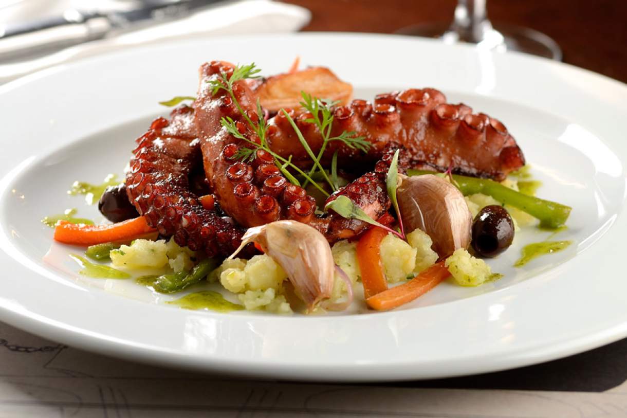 Modo de preparo: Cozinhe o polvo na água com sal por 45 minutos e verifique o ponto de cocção em função do tamanho. Reserve e separe os tentáculos. Em seguida, corte em laminas os pimentões e a cebola. Depois cozinhe as batatas com pele e reserve. Tire a pele das batatas e amasse no garfo, tempere com sal, salsinha picada e azeite. Corte os tomates e dispense as sementes. Salteie no azeite os pimentões e a cebola, tempere com sal e adicione os tomates, azeitonas e dentes de alho. Por fim, salteie no azeite o polvo temperado com páprica defumada e sal até deixar dourado e bem quente por dentro. Num prato, disponha a batata, por cima os legumes e termine pelos tentáculos de polvo.