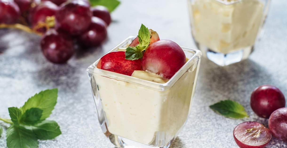 5. Sirva de sobremesa: sempre sirva uma fruta como sobremesa para a criança. Em ocasiões especiais, incremente receitas decorando com frutas, para que elas sempre estejam disponíveis, como no exemplo abaixo: no delicioso Mousse de Baunilha com Uvas. Veja como fazer: