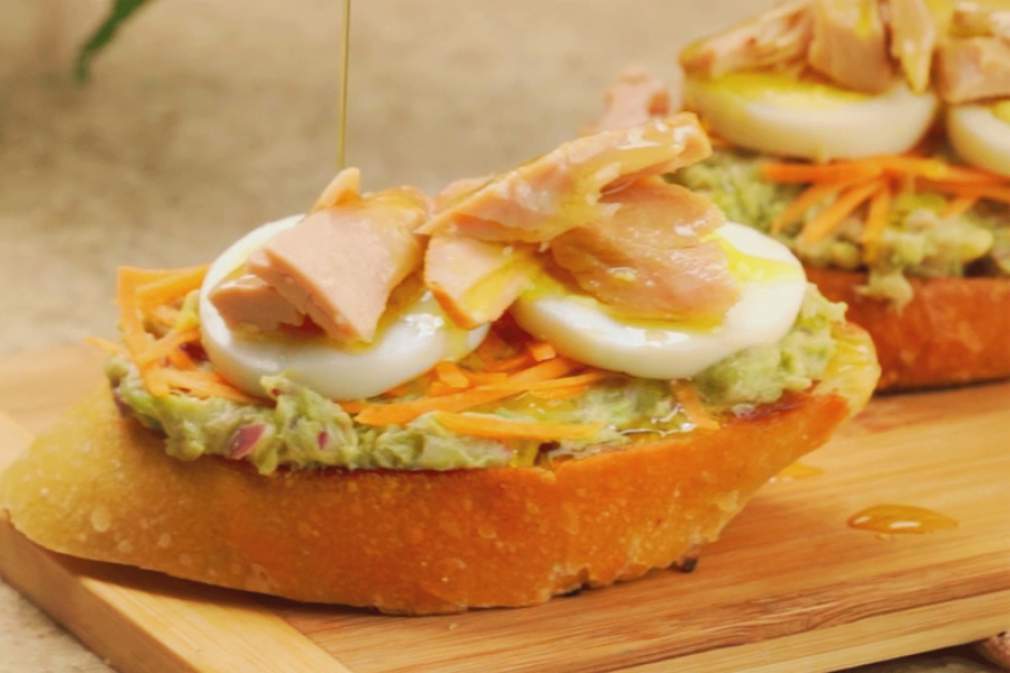 Disponha o creme de abacate na torrada, a cenoura, o ovo e por último o Atum Gomes da Costa