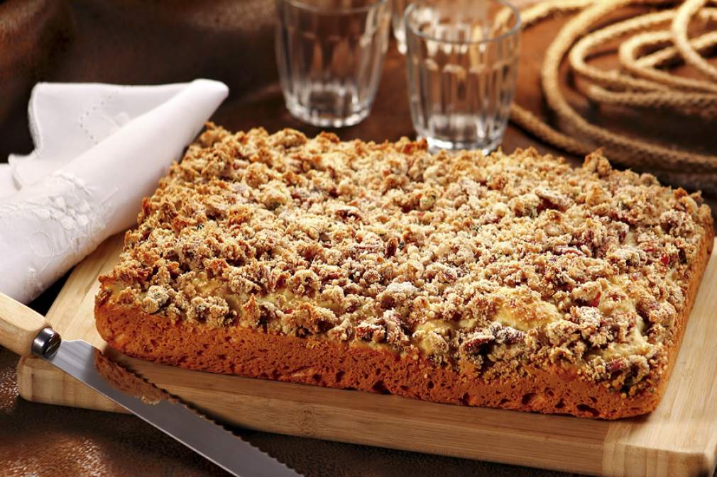 Despeje a massa na assadeira e cubra com a farofa reservada.