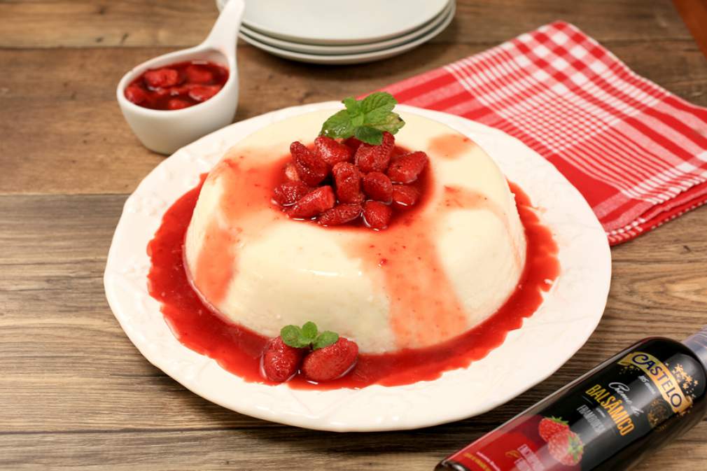 Os morangos combinam muito com Natal! O Creme Balsâmico Framboesa Castelo é elaborado a partir da redução do vinagre balsâmico e o suco natural de framboesa. É encorpado e com sabor frutado marcante. Nesta calda junto com os morangos ficou incrível com a musse de coco. Mas experimente também em sorvetes, flans e saladas de frutas.