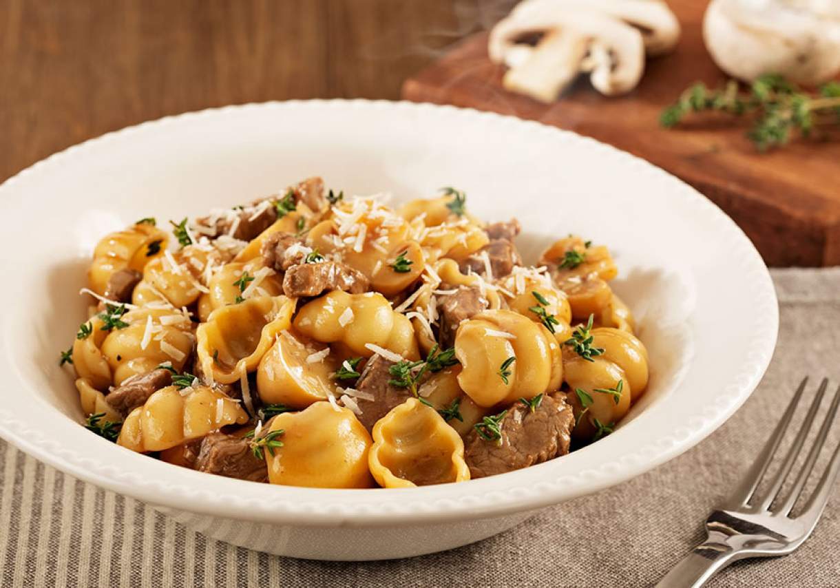 - Retorne o caldo para a frigideira com a carne e os cogumelos, acerte o sal, tempere com a pimenta-do-reino e reserve. A farinha fará o molho engrossar levemente;