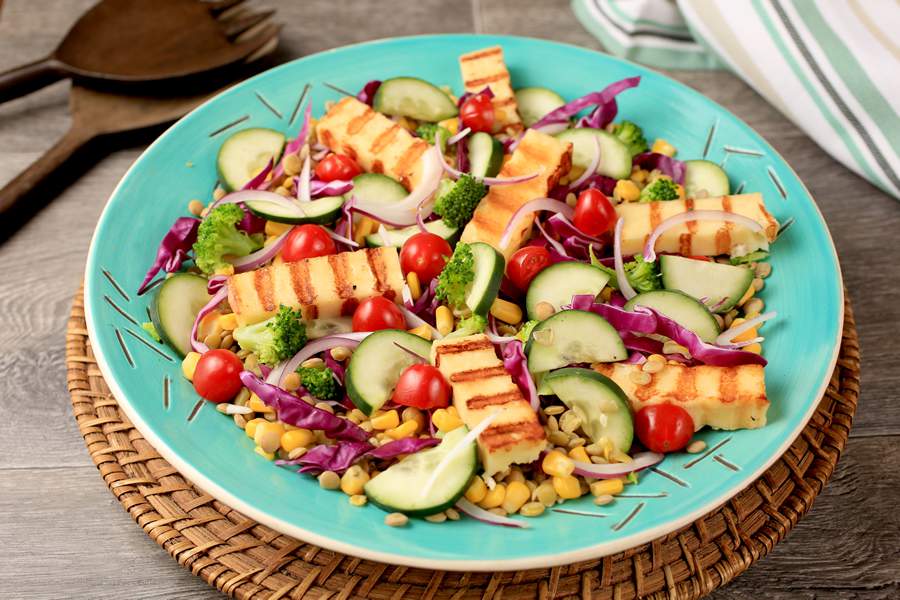 Distribua o repolho roxo, o milho, a lentilha, o brócolis, o tomate, o pepino e a cebola em uma saladeira. Corte o queijo coalho em fatias grossas de 2 x 7cm. Aqueça uma frigideira antiaderente e grelhe as fatias de todos os lados. Arrume sobre a salada e sirva regada com o Molho para Salada Mostarda e Mel Castelo.
