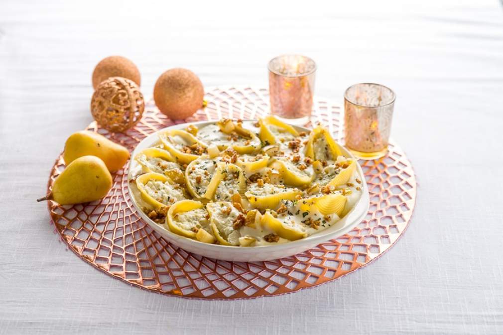- Em uma travessa, recheie o Conchiglioni com as peras e o gorgonzola e cubra com o molho