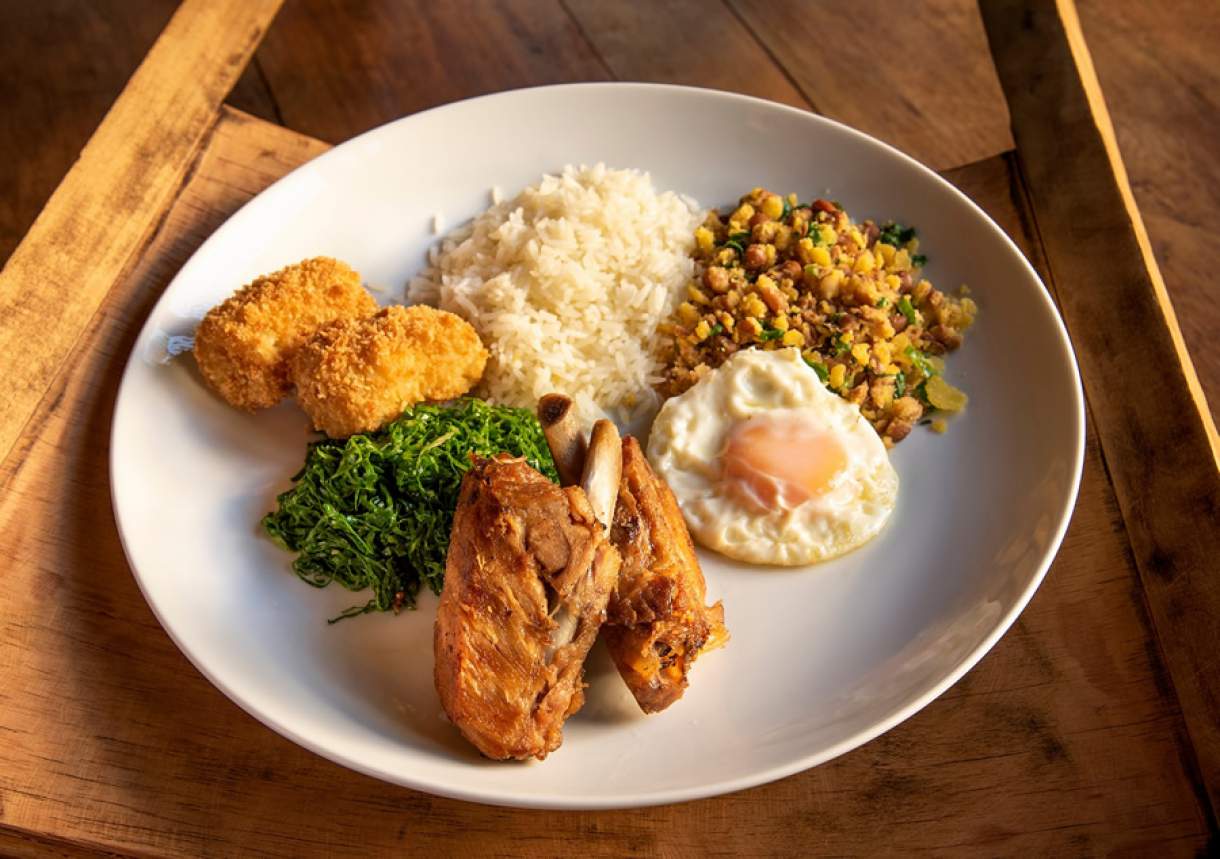Sirva a costela, o virado de feijão e os croquetes de banana acompanhados de ovo frito com gema mole, arroz branco e couve refogadinha no alho.