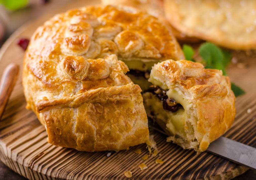 Em uma massa folhada pronta de aproximadamente 30cm, coloque uma peça de queijo brie ou camembert bem no centro.