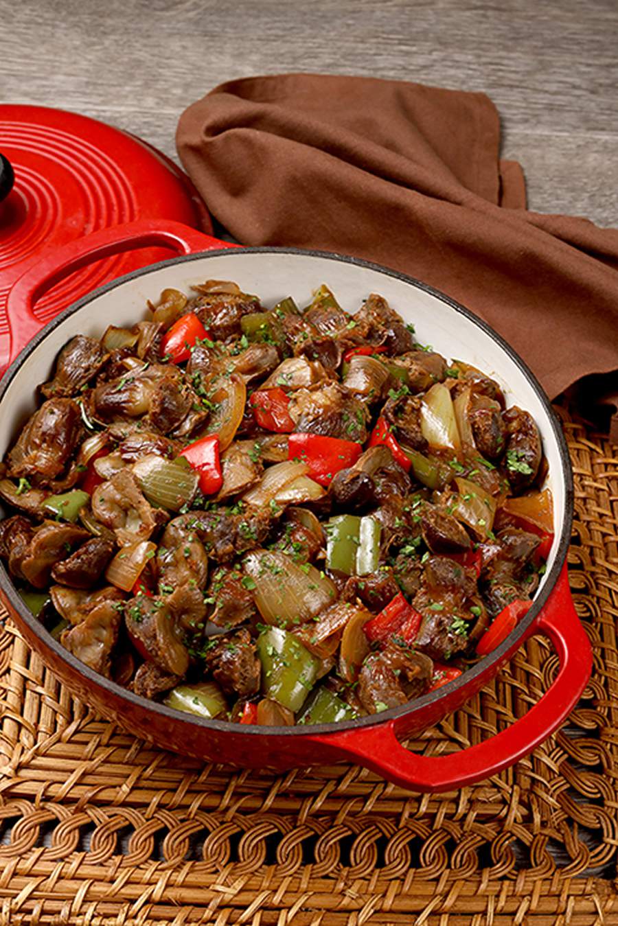 Lave bem as moelas e coloque em uma panela de pressão. Regue com o Vinagre de Maçã Castelo e cubra com a água, o sal e a pimenta. Leve ao fogo e quando começar a pressão, abaixe o fogo e marque 30 minutos. Escorra o caldo e reserve as moelas. Aqueça o Azeite de Oliva Castelo e frite as moelas cozidas até ficarem douradas. Junte a cebola, o alho, os pimentões e o Molho Shoyu Castelo. Deixe refogar por uns 10 minutos e vá adicionando meia xícara (chá) de caldo que sobrou do cozimento das moelas. Junte a salsa e sirva.