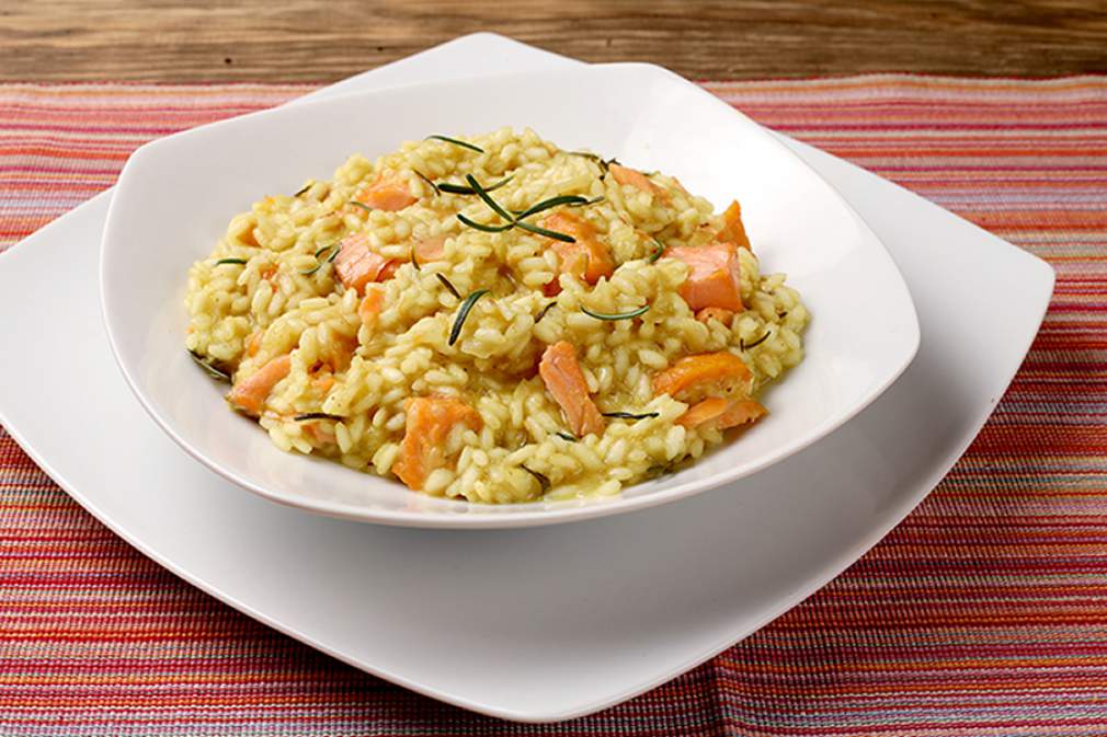 Corte o salmão em cubinhos e tempere com o sal. Refogue o arroz no Azeite de Oliva Castelo por 3 minutos e junte a cebola. Refogue por mais 3 minutos e adicione o vinho branco. Quando começar a secar, vá regando com o caldo de legumes fervente aos poucos. Quando o arroz estiver quase cozido e o caldo estiver acabando, adicione o salmão e o alecrim e cozinhe por mais 4 a 5 minutos. Junte a Mostarda Gourmet Castelo, misture e sirva.