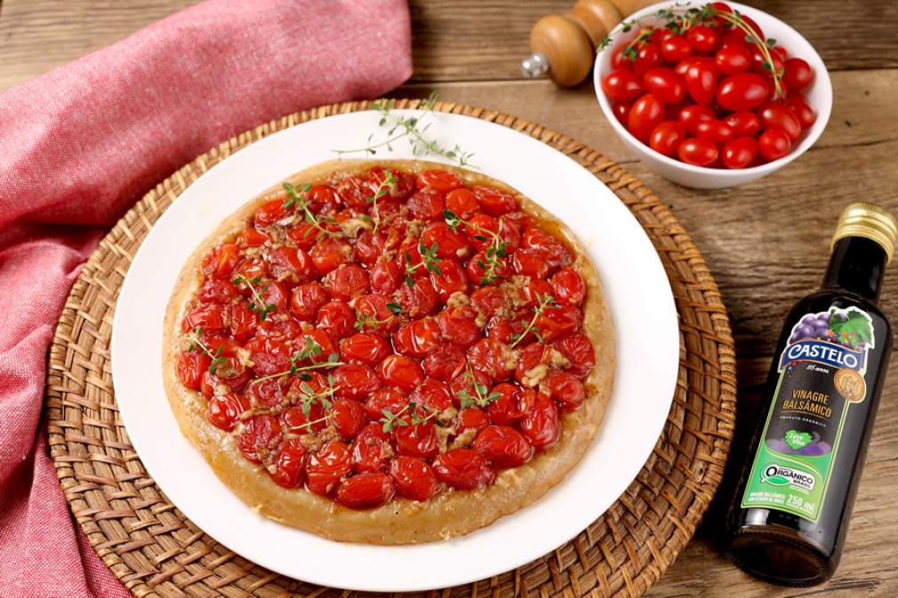 Misture os tomates, o alho, o Azeite de Oliva Castelo, o Vinagre Balsâmico Orgânico Castelo e o sal. Coloque em uma forma de torta média com 20 a 22 cm de diâmetro. Distribua o queijo por cima.