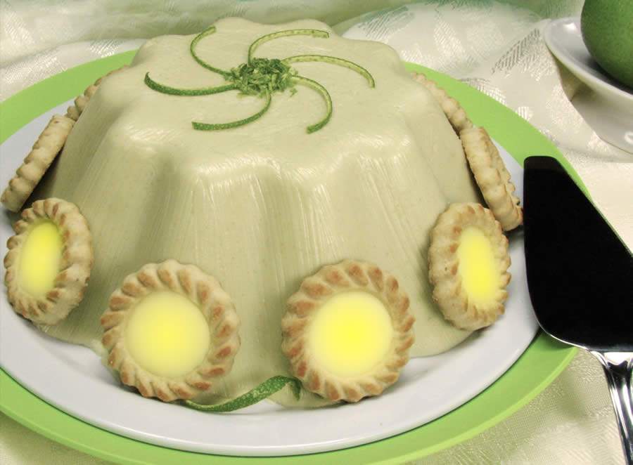- Bata no liquidificador o leite condensado, o creme de leite e o leite com as tortinhas (reserve algumas para decorar). Acrescente a gelatina verde dissolvida em 5 colheres de água morna e bata para misturar bem. Retire a mistura e junte as raspas de limão (sem bater).