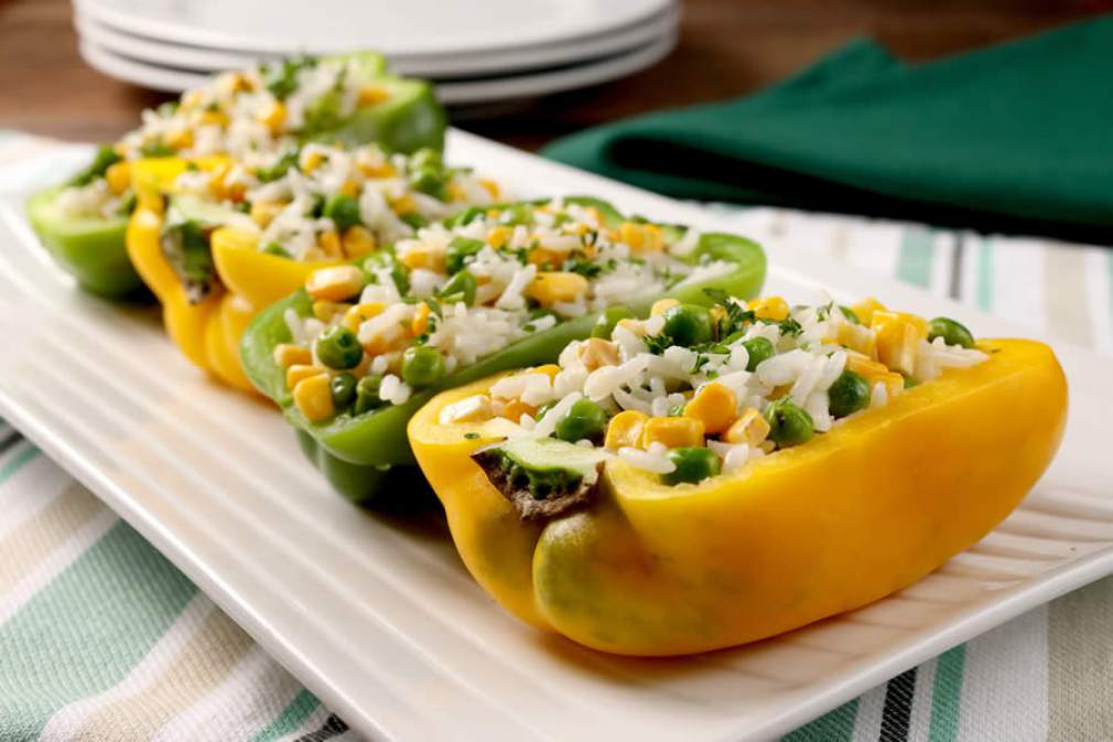 Corte os pimentões ao meio, no sentido do comprimento. Retire as sementes e cozinhe em água fervente por 5 minutos. Escorra e reserve. Doure a cebola no Azeite de Oliva Castelo. Adicione o arroz e o sal, mexa por 2 minutos e adicione a água fervente. Quando começar a secar, acrescente as ervilhas, o milho e o Molho de Salada Limão Castelo. Recheie os pimentões com o arroz e leve ao forno médio (180℃), por cerca de 15 minutos até esquentar bem. Retire, salpique a salsa e sirva.