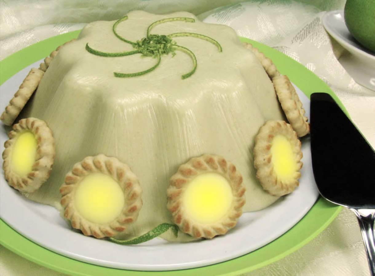 - Bata no liquidificador o leite condensado, o creme de leite e o leite com as tortinhas (reserve algumas para decorar). Acrescente a gelatina verde dissolvida em 5 colheres de água morna e bata para misturar bem. Retire a mistura e junte as raspas de limão (sem bater).