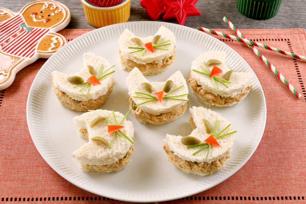 Corte cada fatia de pão no formato de cara de gatinhos. Recheie cada carinha de pão com o recheio de frango. Cubra com outra carinha. Faça o mesmo com todos os gatinhos. Decore, fazendo o olho com a Azeitonas Verdes Castelo, o nariz de tomate e os bigodes com a cebolinha verde. Sirva.