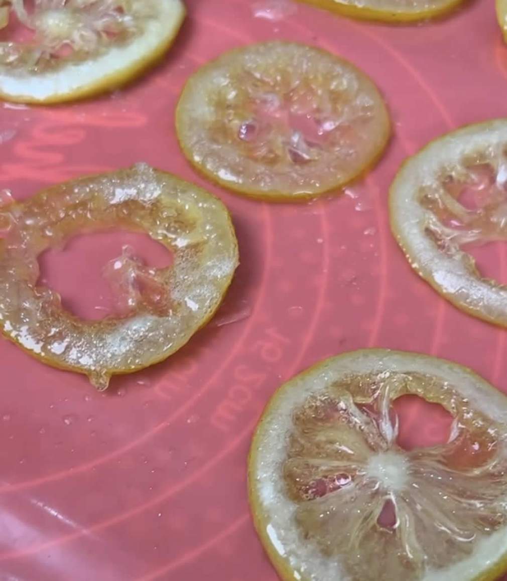 ● Quando o açúcar derreter, coloque as rodelas de limão sem as sementes e deixe por uns 5 minutos, até a calda engrossar.