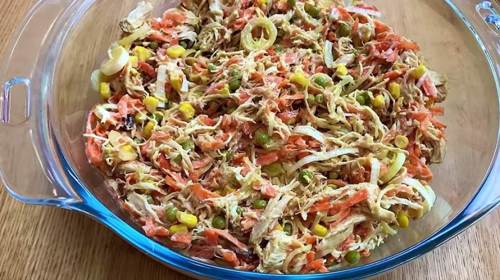 Em um recipiente junte o frango desfiado, a cenoura ralada, o presunto picado, o milho verde, a ervilha e a cebolinha verde picada. Misture 1 xícara de batata palha.