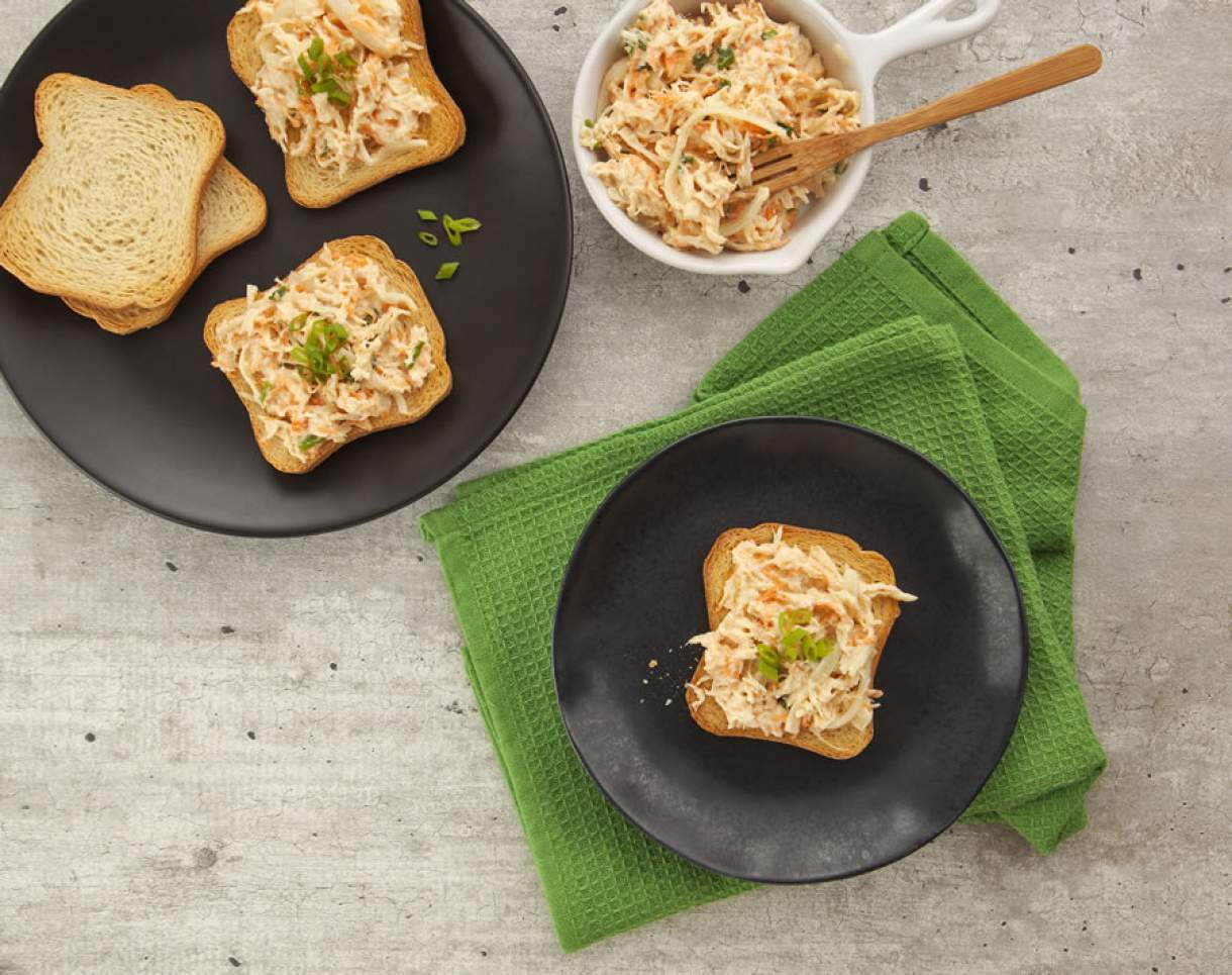 - Em um recipiente, coloque o frango e o restante dos ingredientes. Misture bem, acerte e sal e sirva sobre a Torrada Piraquê Tradicional.