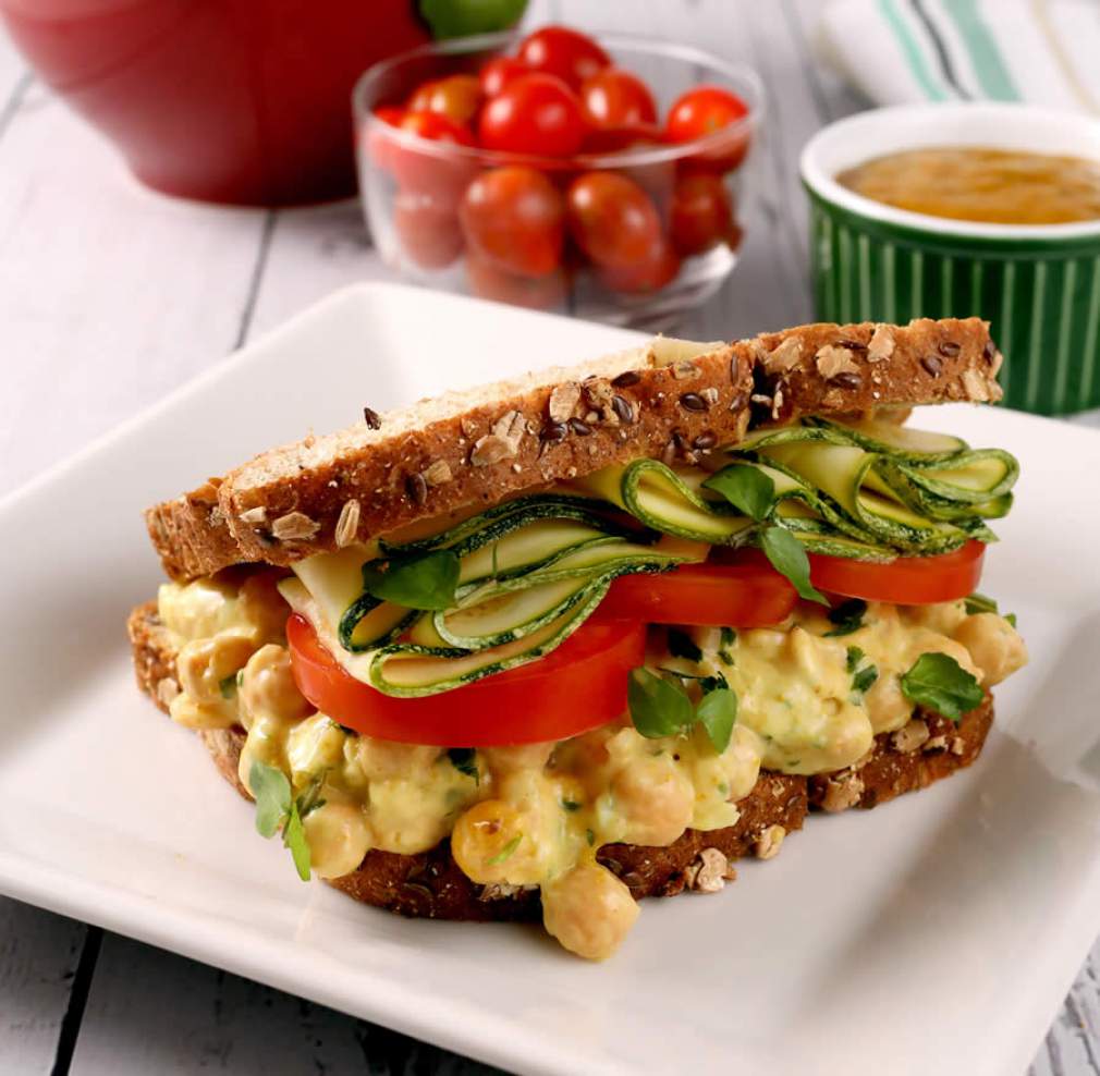 Montagem: Distribua a pasta de grão de bico em 4 fatias de pão integral. Por cima, enfeite com o tomate e por cima, arrume as abobrinhas marinadas. Tampe com o restante das fatias. Se quiser enfeite com mini agrião.